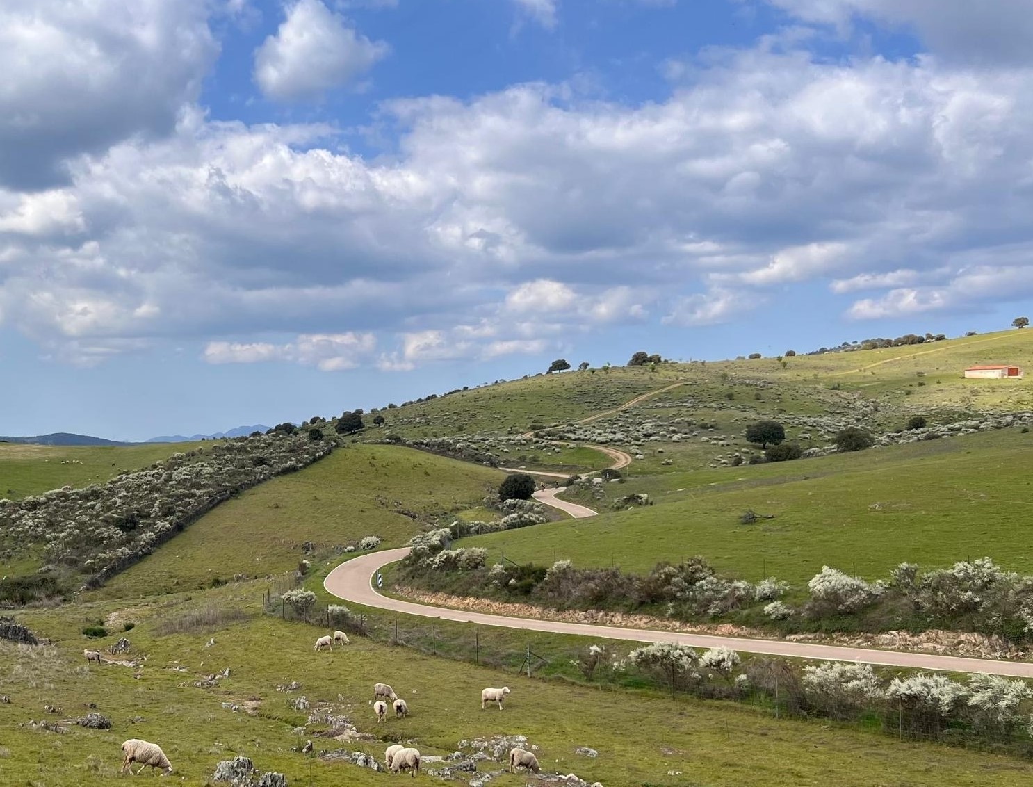 Once past the only village in the stage, it gets more hilly and you enter the ‘dehesas’ the classic environment of this region. Dehesas are light forest of holm- or cork oaks serving as pastureland. They provide an ideal habitat for both cattle as wildlife. Keep your eyes peeled for some of the later crossing the road ahead, as the sizable bright-green lizard or the Egyptian mongoose, with its low, dark profile; while colourful birds as roller, bee-eater or hoopoe fladder around. Destination is a rural accommodation next to a quiet village in a great setting, midway up the flanks of the sierra.